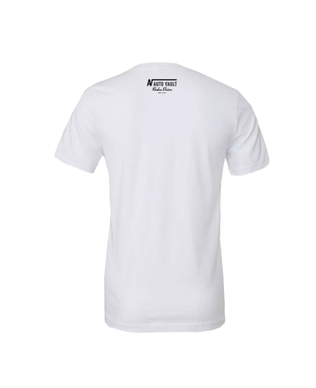 The sporty "AV" racing flag icon on the left sleeve nods to motorsport heritage while the back is finished with a minimalist “Auto Vault Rodeo Drive” print at the neck.
